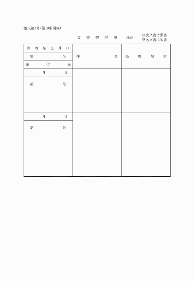 (2) 往復文 大町水及び課(必要ある場合は係)の首字一字を冠し、文書整理簿(様式第3号)により、業務課において年度による一連番号を附し、その事件完結に至るまで、往復数次にわたるも同一番号を用いる。