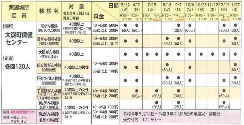 | 胃バリウム検診 (個別:医療機関) | ・済生会御所病院 ・大和橿原病院 | 2000円 (65歳以上 500円) | 令和8年4月~令和9年2月末 |