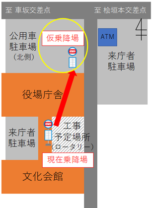 町役場庁舎のロータリー改修工事が実施されることに伴い、現在ロータリーに設置されている停留所を下記のとおり一時的に移設します。ご迷惑をおかけしますが、ご理解ご協力のほど、よろしくお願いいたします。
